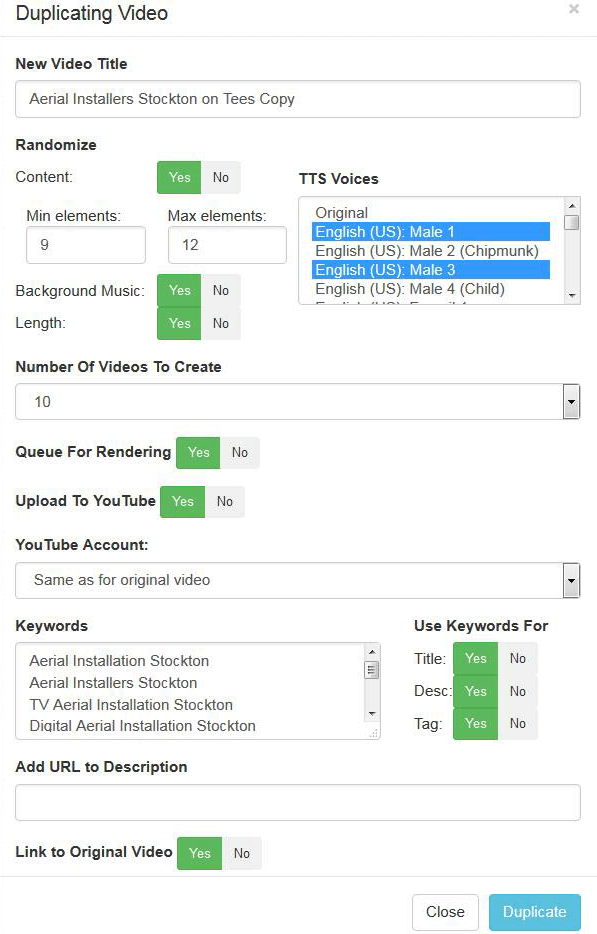 This group of videos can then be published to Youtube automatically, with EACH video targeting a specific keyword.