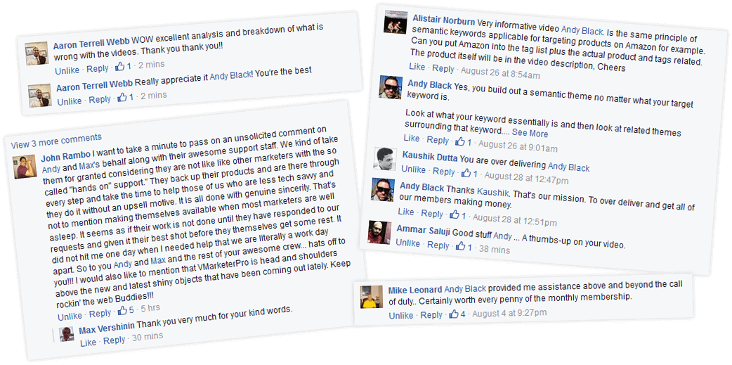 Full access to our PRIVATE community Facebook Group where Max and I along with our members can share tips, strategies and offer help. It’s the hub of vMarketerPro where it is easy to reach out and tap into a huge ‘ever expanding’ knowledge base.